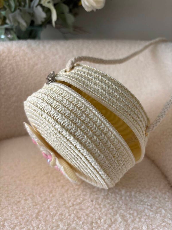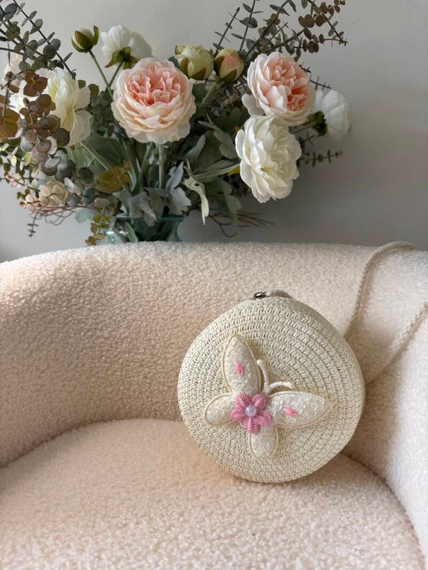 Leuke gevlochten meisjes tas met een vlinder erop. Er zit een rits in, zodat je niks kwijt kan raken. Touw is lang genoeg om tot 9 jaar ongeveer over de schouder te dragen maar is ook verstelbaar.
