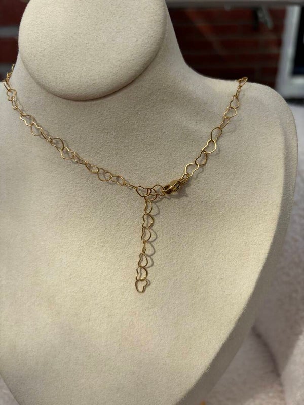 Handgemaakte RVS ketting van hartjes, het is een schakelketting van ongeveer 45 cm. Je kunt deze ketting ook als dubbele armband dragen.