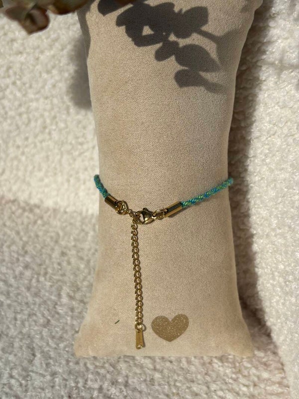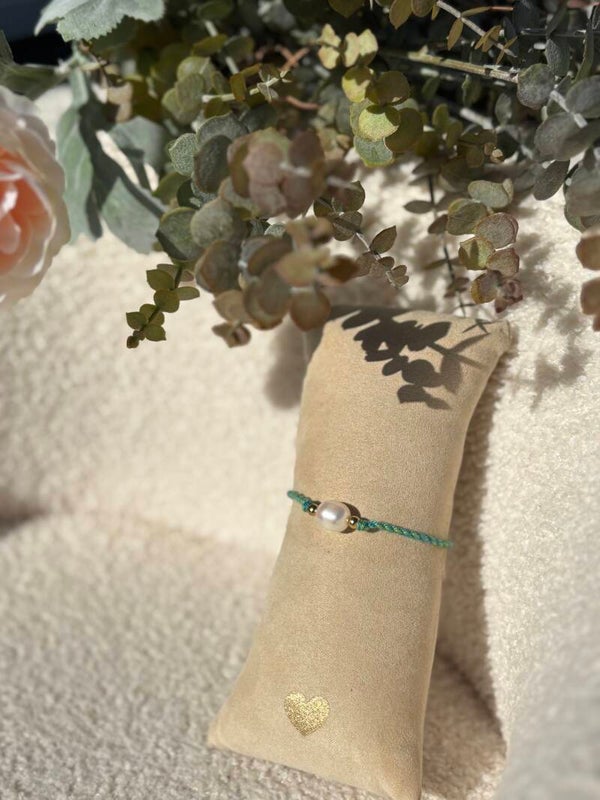 Armband van gevlochten touw met een imitatieparel en een goudkleurige RVS sluiting. Het is een mix van groen en blauw gevlochten touw en er zit een verlengkettinkje van ongeveer 5 cm aan de sluiting.
