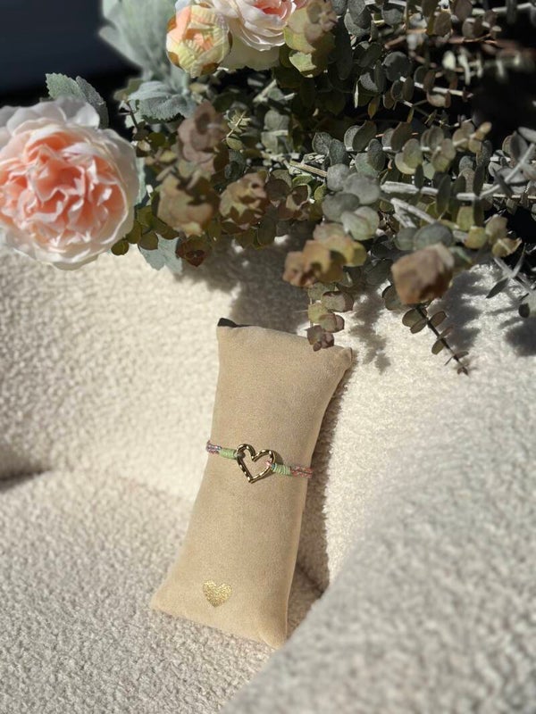 Armband van gevlochten touw. Het is een mix van vrolijke maar zachte kleuren waardoor de kleurenmix niet overheerst. De armband heeft een goudkleurige RVS hartbedel en is afgesloten met een goudkleurige RVS sluiting met een verlengkettinkje van ongeveer 5 cm.