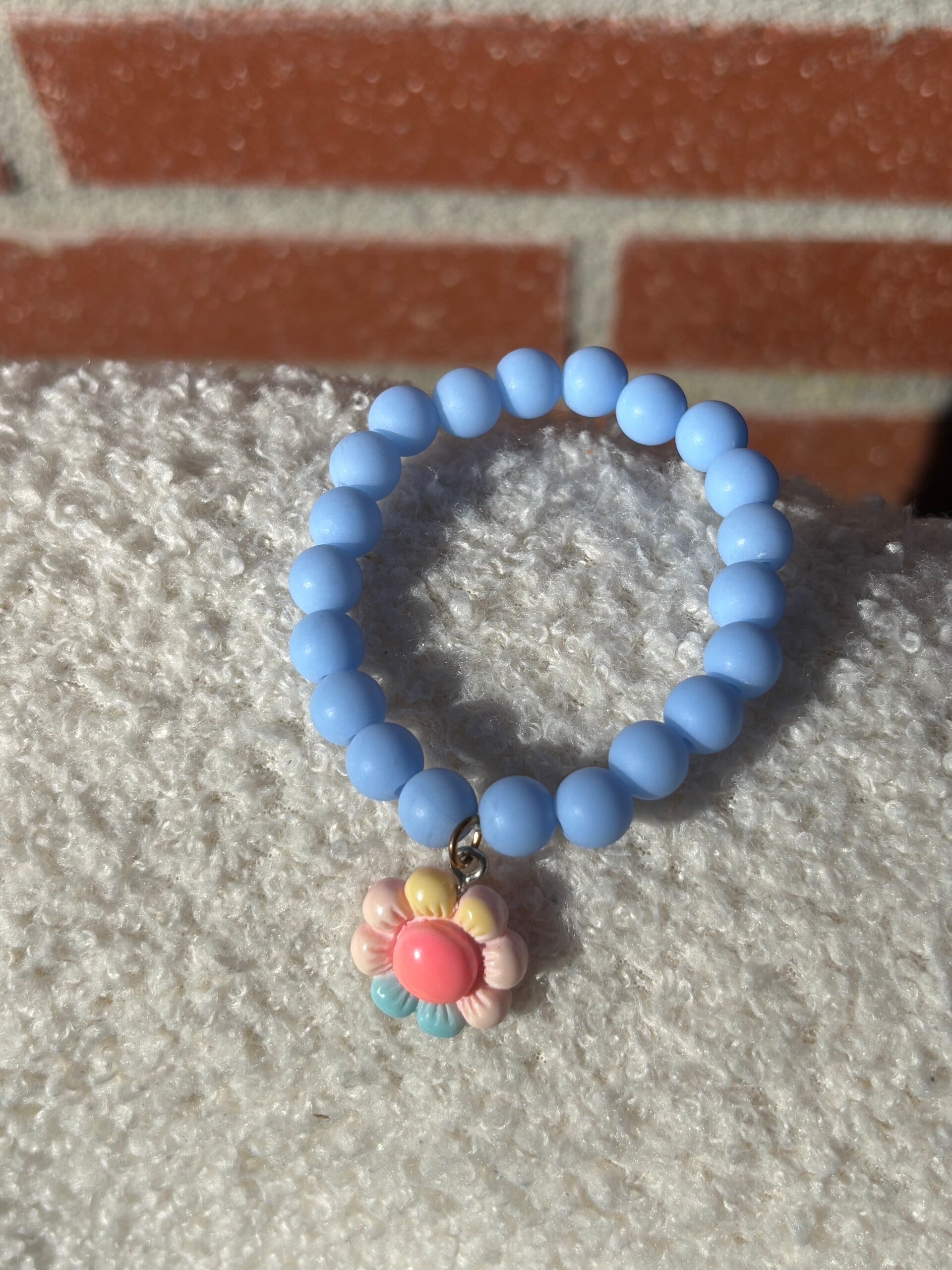 Kinderarmband met 8mm lila kralen met een bloemenhanger. Deze armband is geregen op elastiek en past bij de meeste kinderen in de leeftijd van 3-6 jaar.