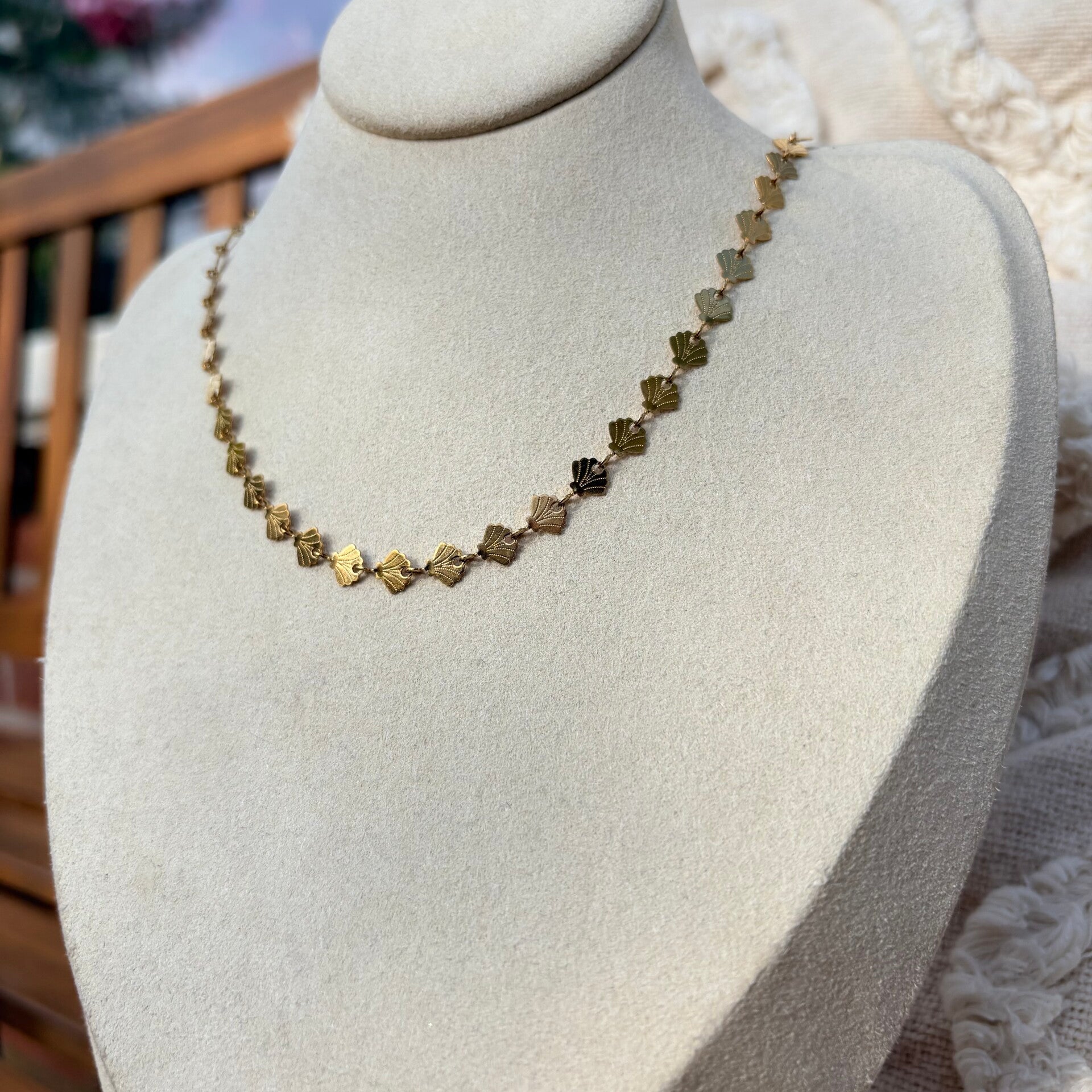 Handgemaakte RVS ketting in de vorm van schelpjes. Zowel in zilver als goudkleur te verkrijgen. De lengte van de ketting is ongeveer 40 cm + een verlengkettinkje van 5 cm. Mocht je een langere ketting hiervan willen is dat op aanvraag mogelijk.